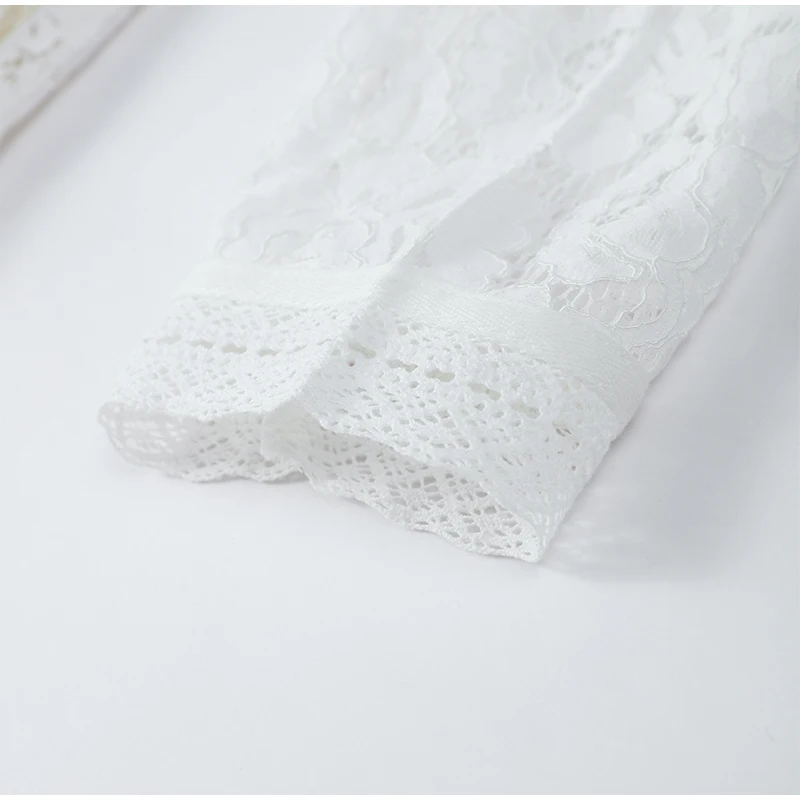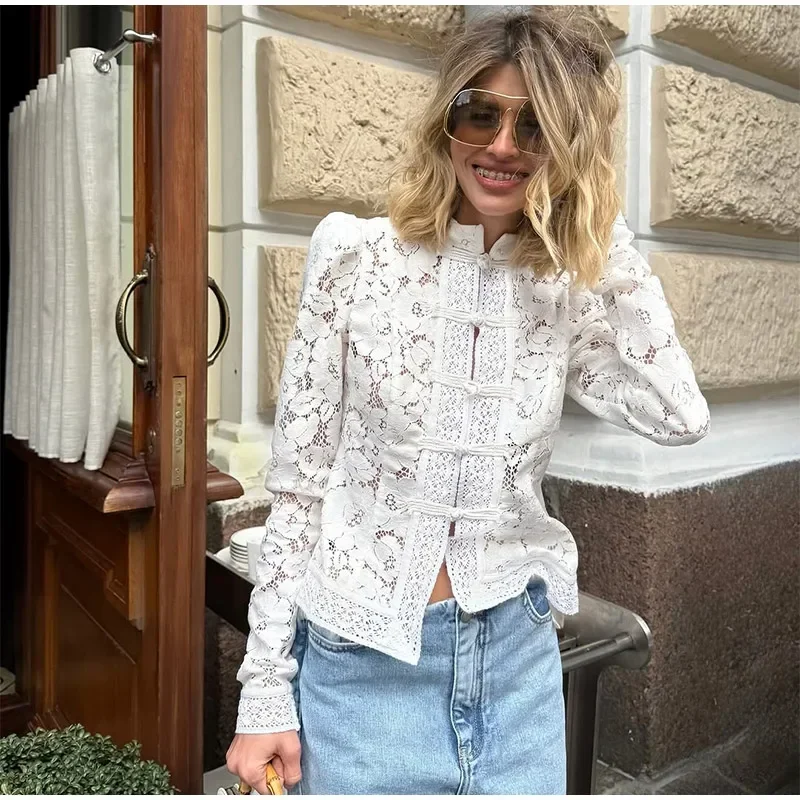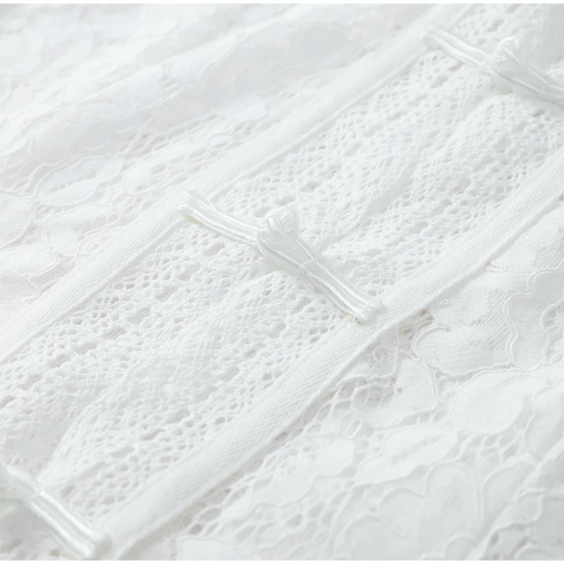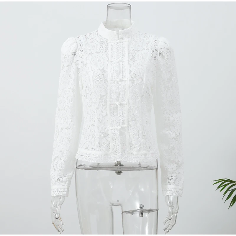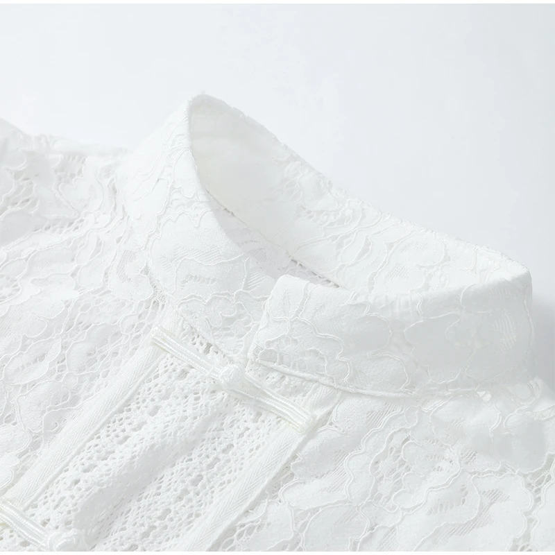 Design retrô elegante: padrão de renda oca com inspiração oriental e gola alta refinada.