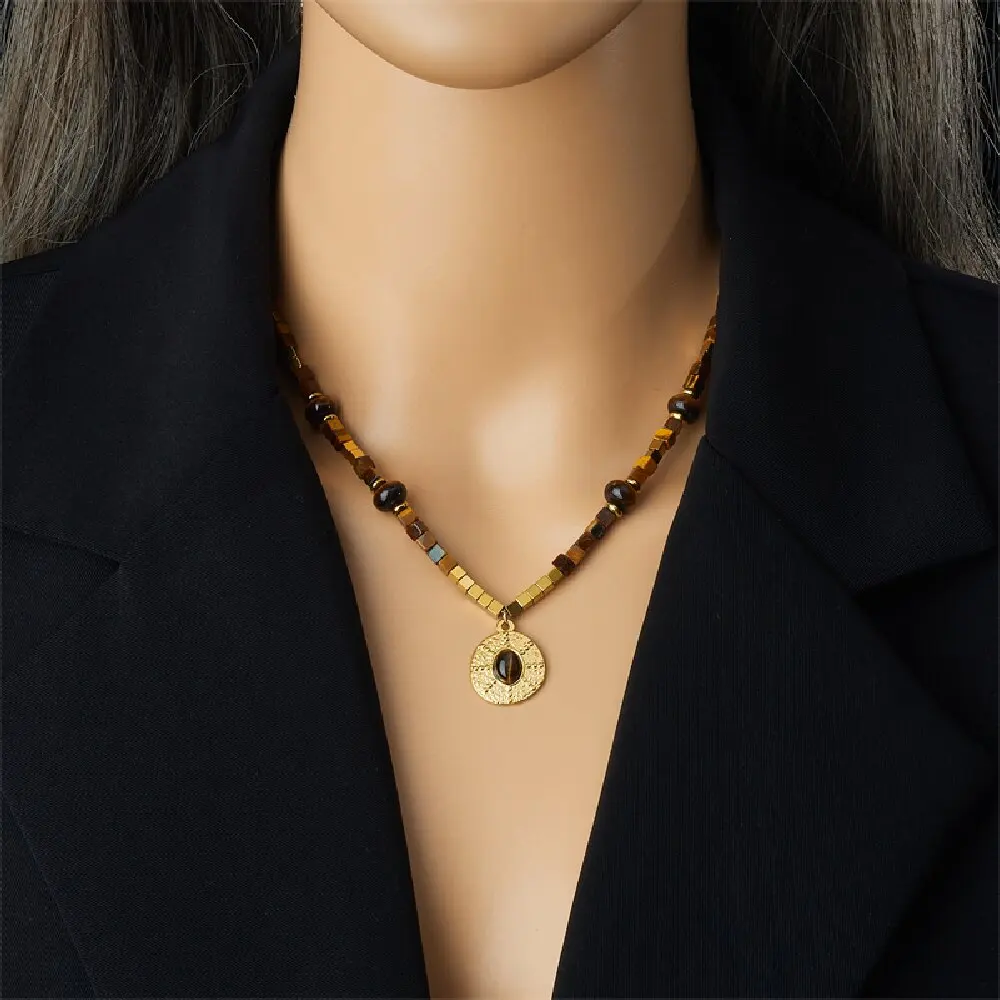 Descubra o poder e o estilo em um só acessório com o TigreSolar, um colar feminino que une elegância vintage, misticismo e um toque moderno. Com um pingente de olho de tigre natural emoldurado por detalhes dourados e uma corrente composta por contas geométricas, essa peça é perfeita para quem busca expressar confiança e personalidade com sofisticação.